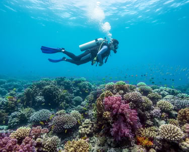 Dive into crystal-clear waters teeming with vibrant coral reefs and diverse marine life.